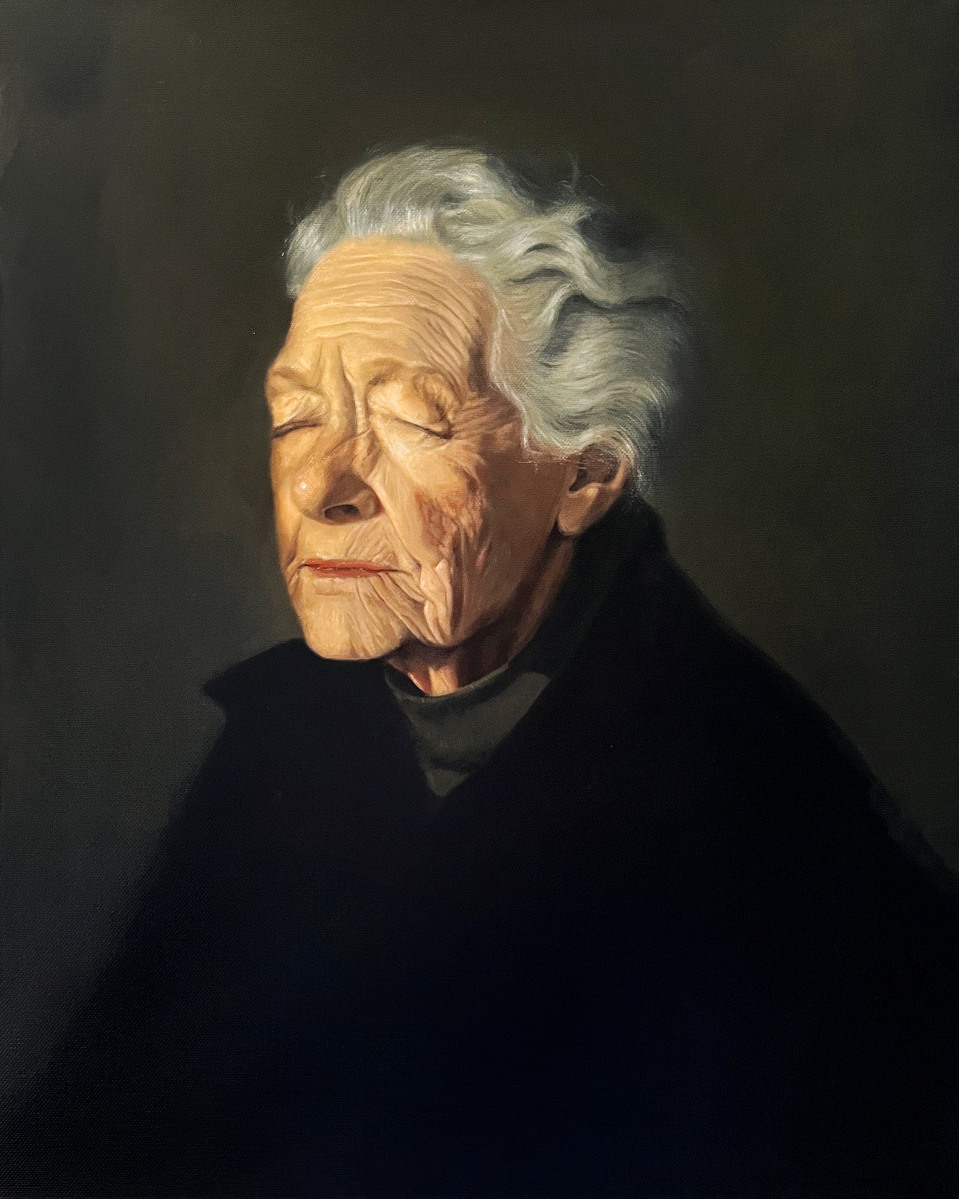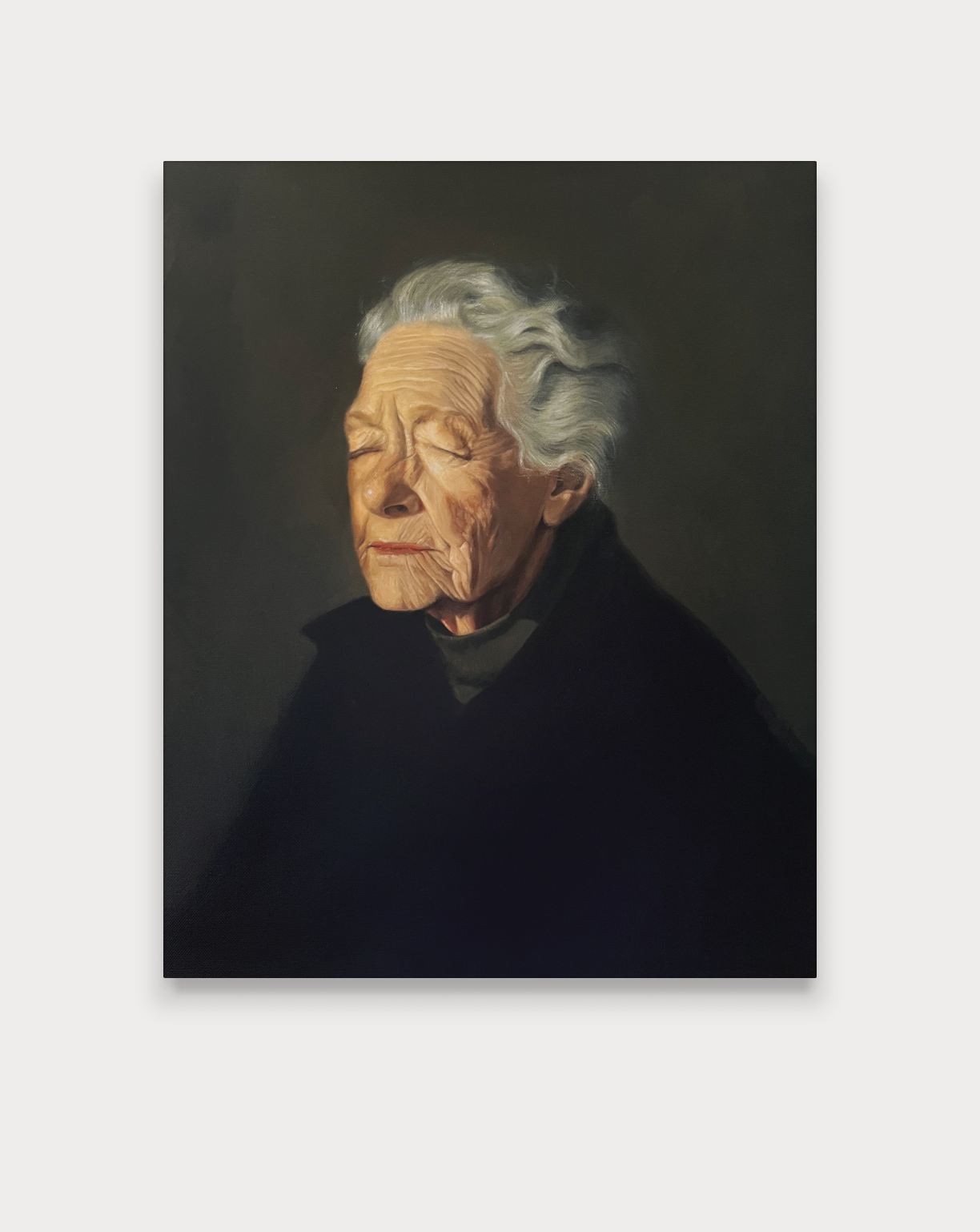 Het schilderij “130” toont een oudere vrouw met haar ogen gesloten, een reflectie op de lange strijd voor gelijke rechten.