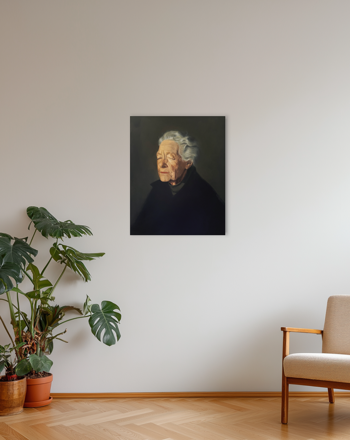 Dit olieverfschilderij is volledig uniek en authentiek, met de hand geschilderd door portret kunstenaar Carola Jansen. Elk detail, van kleur tot penseelstreek, is zorgvuldig uitgewerkt om de aanwezigheid en emotie van het onderwerp te vangen.