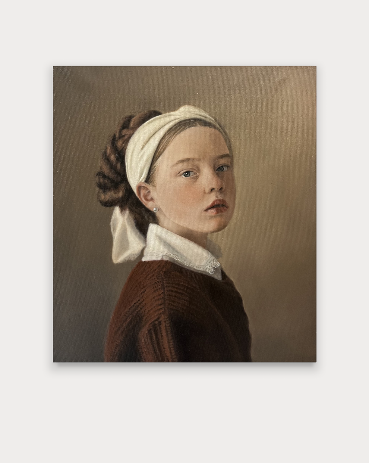 “My Girl with a Pearl” is een eerbetoon aan Vermeer's iconische Meisje met de parel. Ik heb zijn meisje niet gekopieerd, maar opnieuw benaderd: met mijn eigen kleurgebruik, mijn eigen blik, mijn eigen idee van kracht. Het resultaat is een portret dat tegelijk vertrouwd en nieuw voelt.
